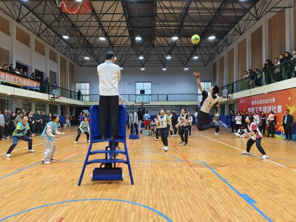 2025年11月25日晚,南华大学2025年教职工气排球比赛决赛在红湘校区南体育馆进行。数理学院代表队与经管法学院代表队在历经多轮激烈角逐后胜利会师决赛,上演了一场精彩纷呈的巅峰对决。最终,数理学院气排球队凭借出色的发挥和默契的配合,力克强敌,斩获本次比赛冠军。